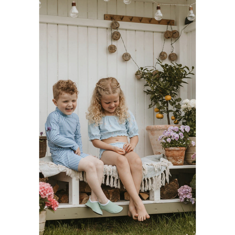 Introducing the Vanilla Copenhagen Fern Green Swim Shoes, ideal for your child's aquatic adventures. Crafted from durable, water-resistant materials with a vibrant green hue and playful pattern, these shoes ensure a snug and comfortable fit. Lightweight and easy to care for, they enhance safety with their slip-resistant sole, perfect for both beach and pool days.