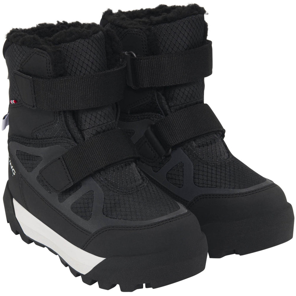 Introducing the VIKING Black Constrictor Warm SC WP 2V, the ultimate winter boots designed to keep your young explorer cozy and protected during their chilly adventures. Crafted from Solarcore®, a breakthrough fabric developed by NASA, these boots uniquely capture and intensify warmth as your child moves, ensuring superior comfort on even the coldest days. The boots dazzle in a sleek black color accented with a rugged pattern, perfect for both style and functionality.