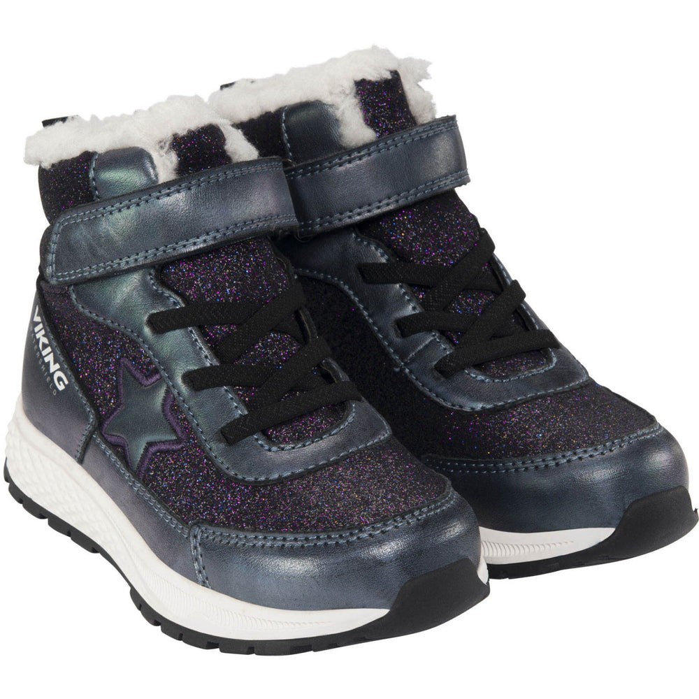 Keep your little one cozy and stylish with the Viking Black Equip Star Warm WP 1V SL Winter Boots. Designed for children, these boots boast a gleaming, iridescent upper coupled with elastic laces and a secure Velcro fastener that ensures a snug, customizable fit. The Watershield membrane by Viking repels water effectively, while the internal insulation battles the chill. Additionally, the robust rubber outsole guarantees excellent traction for all sorts of playful escapades. Perfect for pairing with a winter playsuit, these boots also feature a convenient foot strap gap for easy dressing!