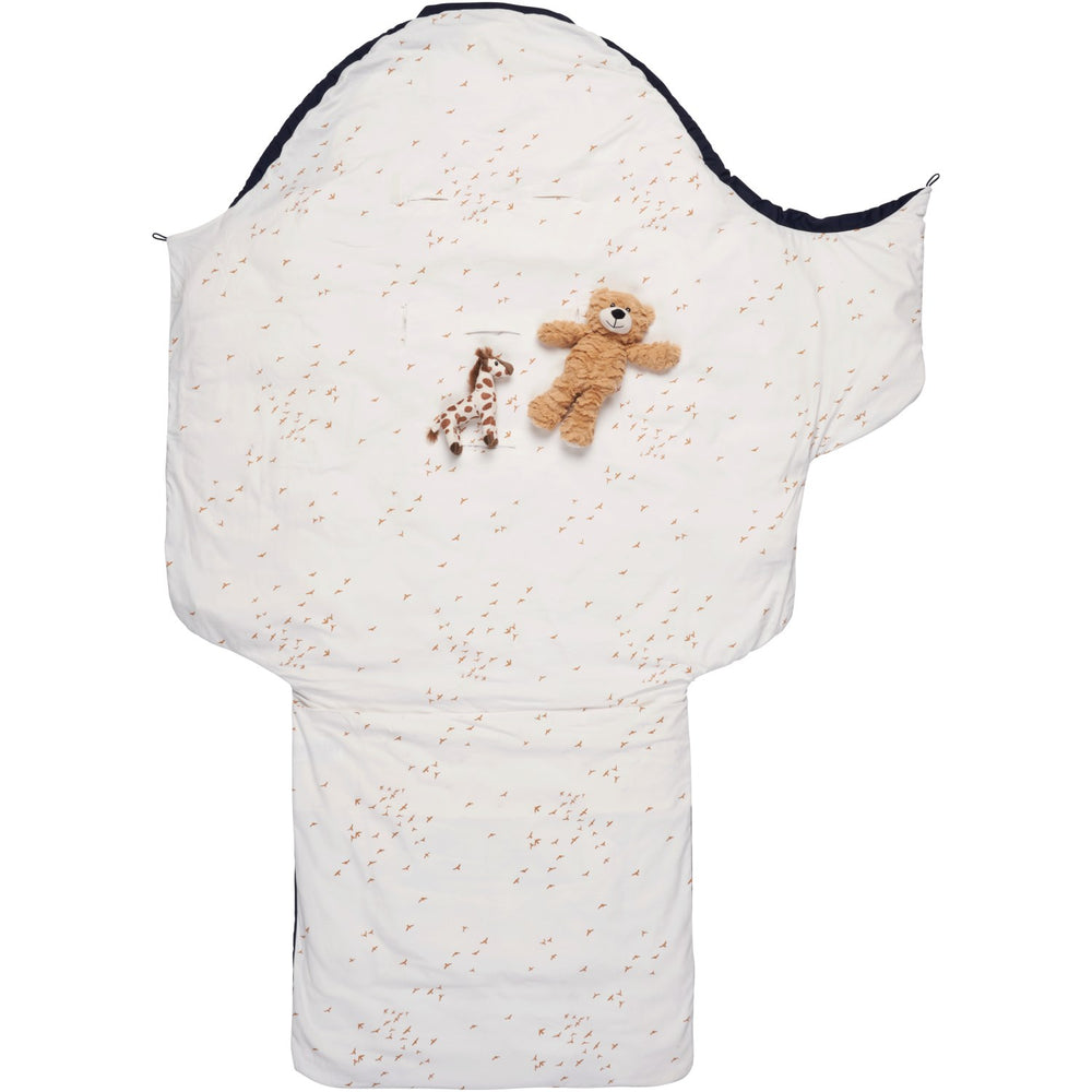 Discover the multifunctional Voksi® Classic+ Mini, an advanced version of the beloved Footmuff, designed to ensure your child's comfort and safety in all conditions. With its exclusive wool filling and innovative breathable properties, this sleeping bag ensures optimal temperature regulation, all year round. The wool is ideal for keeping your child warm in the winter and cool in the summer, while the pre-cut holes for harnesses offer increased safety. The revamped Voksi® Classic+ is equipped with practical leather details and a fresh print design that not only looks great but also increases functional capabilities. As a true year-round sleeping bag, the wool duvet can easily be replaced with a summer duvet, making it the perfect solution for any season. The usefulness doesn't stop there; This versatile sleeping bag can also be used as a duvet, play blanket or even as a carrycot with the accompanying carrying board. Easy maintenance and storage make the Voksi® Classic+ Mini an indispensable part of your child's daily life, stimulating and entertaining at the same time. Safe, comfortable and practical - Voksi® Classic+ Mini is the ideal companion for your child from infant to toddler.