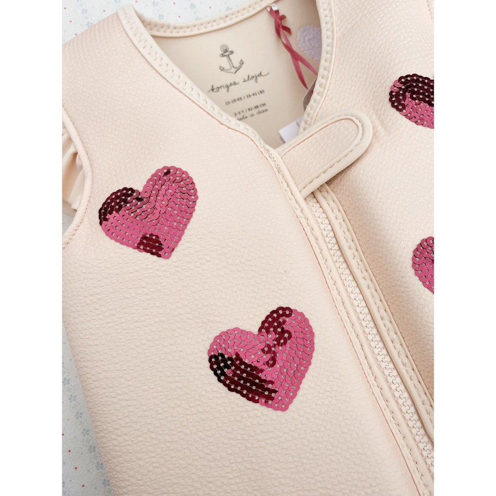 Introducing the Konges Sløjd Ecru Avery Swim Vest, the perfect blend of safety and fun for your little swimmer! This swim vest features enchanting sequin Valentine's hearts, ensuring your child stands out stylishly and safely. It's ingeniously designed with a zipper and Velcro closure for easy wear, plus a buckled safety crotch strap to keep the vest securely in place. Ideal for young adventurers, it promotes confidence in the water, while being simple to store and maintain for endless aquatic fun.