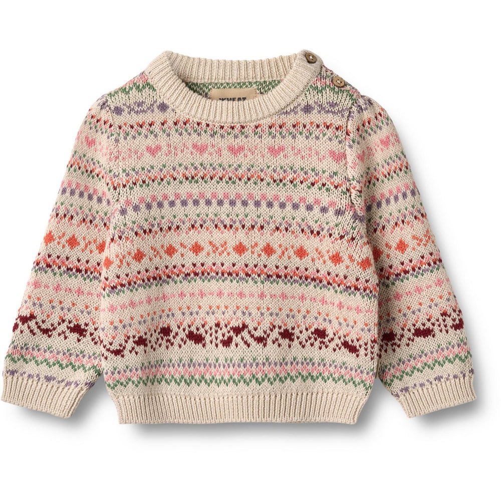 Keep your little one cozy and stylish with our Wheat Multi Jacquard Pullover Olga. Perfect for all seasons, this long-sleeved knit pullover is crafted from 100% organic cotton, ensuring utmost comfort without any itchiness. The pullover features a relaxed fit and raglan sleeves to enhance movement, along with ribbing at the neckline, cuffs, and bottom hem for a snug fit. Highlighted by a unique jacquard pattern and easy-access opening at the left shoulder, it's ideal for quick changes. The pullover is GOTS certified and adheres to the Standard 100 by OEKO-TEX®, promising top quality and safety for your child's skin. Dress it up with leggings or layer it over a dress to suit any occasion.