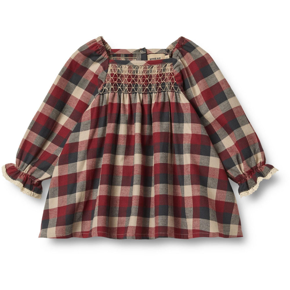 Discover the charming Wheat Red Blue Check Dress L/S Lace Bella, crafted from 100% GOTS-certified organic cotton to ensure softness against your baby's skin. This beautiful long-sleeved dress features exquisite smock details at the chest and a unique wide neckline, enhancing its adorable checkered design. With its loose fit and balloon sleeves, it combines style with ultimate comfort. Practical buttons at the back and cute lace details on the sleeve cuffs add functional elegance. Perfect for pairing with tights or a cozy knit, this versatile dress is ideal for both daily wear and special occasions, keeping your little one comfortably stylish throughout the day. Materials: 100% organic cotton Washing instructions: Remember to follow washing and user instructions Certifications: The product is GOTS certified