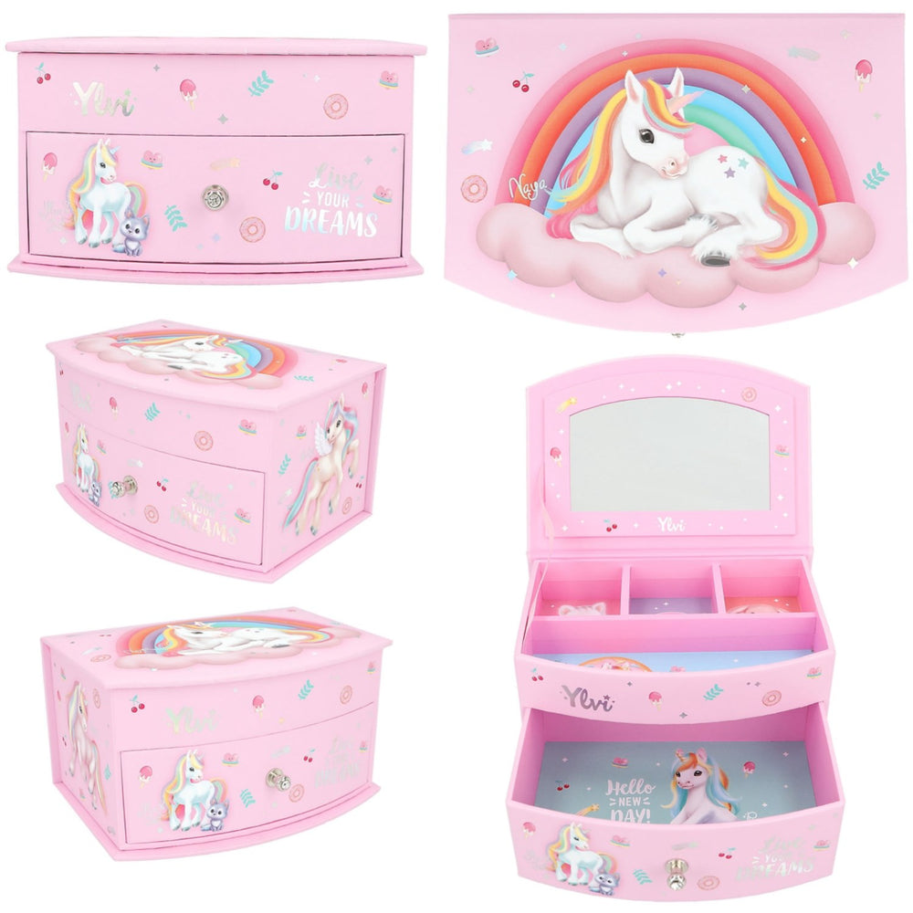 Discover the enchanting Ylvi Jewelry Box, perfect for safeguarding your child's favorite treasures! Crafted in a delightful pink hue, this exquisite box features whimsical unicorns and adorable animal friends, bringing a touch of magic to any children's room. Not only does it charm with its vibrant design, but it also promises ultimate safety and durability with its sturdy build. The Ylvi Jewelry Box is thoughtfully designed with functionality in mind. It includes a hinged lid that opens to reveal a handy mirror, ideal for admiring their precious jewels. Additionally, a pull-out drawer with a sparkling rhinestone knob provides ample storage for various trinkets and baubles, ensuring they are always organized and within easy reach. Beyond its practical benefits, this jewelry box serves a dual purpose as an educational and stimulating piece, enhancing both organization skills and aesthetic appreciation from a young age. Its ergonomic design ensures it is easy for little hands to handle, making it a comfortable and inviting addition to their daily routine. Indulge your little one with the Ylvi Jewelry Box—a treasure chest that makes storing and admiring their cherished items a joyful adventure!