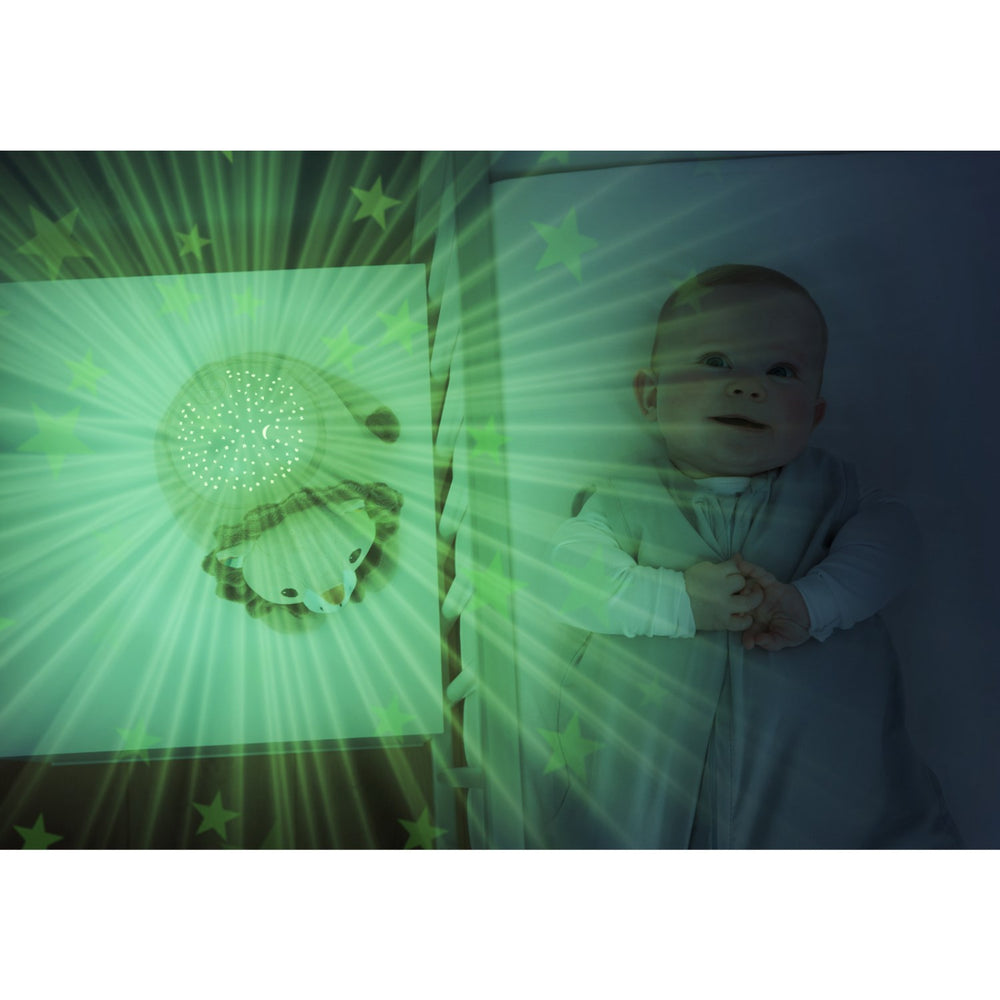 • Projects magical stars on the ceiling in four different colors: orange, blue, green, or multicolored.