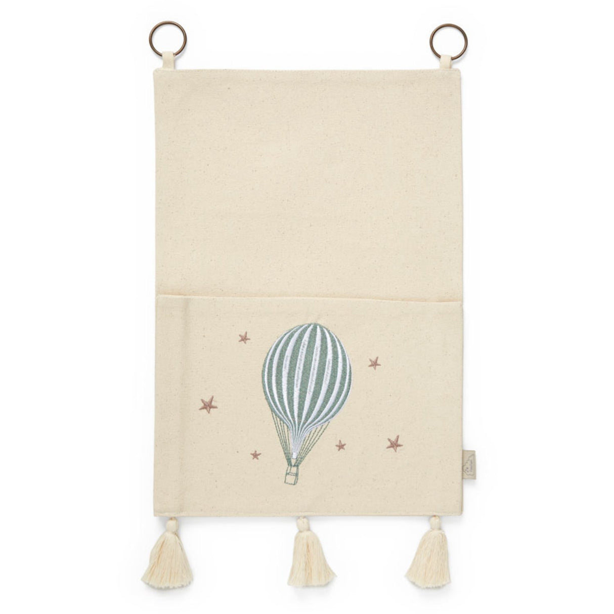 Brighten and organize your child's space with the Cam Cam Copenhagen Dreamland Wall Pocket. This enchanting storage solution, crafted from GOTS-certified heavy canvas, not only brings visual delight with its beautifully embroidered Hot Air Balloon from the Dreamland series but also enhances functionality. Adorned with cute pompoms and easily attached via metal rings, it serves as a charming, durable option for keeping essentials within reach. Ideal for storing small toys, craft supplies, or nursery items, it adds a touch of whimsy and orderly style to any child’s room. Materials: 100% Organic Cotton. Ring: 100% Metal. Category: GOTS Certified Organic - ETKO 4401 Measurements: 37 x 26 x 0.7 cm Washing instructions: Do not wash. Wipe with a damp cloth only. Certifications: GOTS