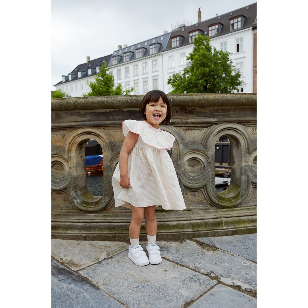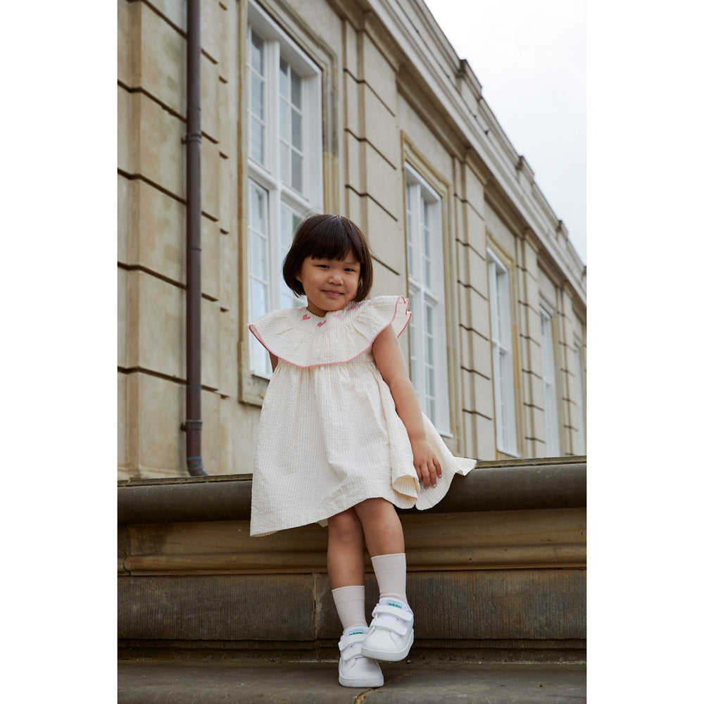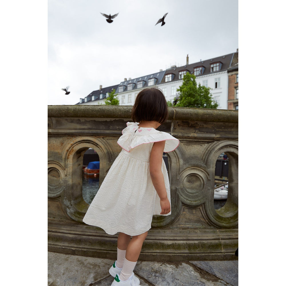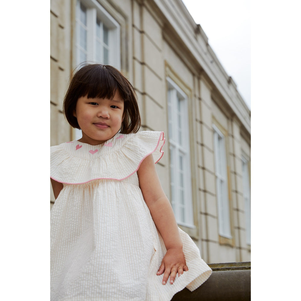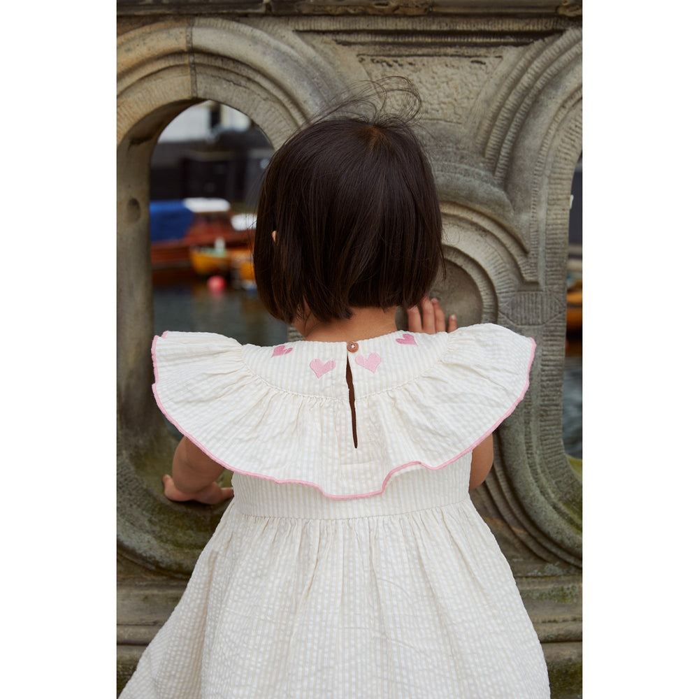 Discover the charm of our COPENHAGEN COLORS Dusty Rose W Cream Stripe W. Pink Seersucker Dress with Heart, a delightful addition to your little one's wardrobe. Made from 100% GOTS-certified organic cotton, this dress ensures your child stays comfortable and rash-free throughout their playful activities. It features a whimsical heart embroidery at the frill collar and is adorned with subtle, classic stripes that enhance its visual appeal.