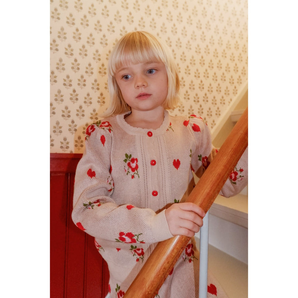 Discover the charm of the Nova Cardigan, crafted from heavy-knitted cotton for optimum warmth and comfort. This delightful piece features a captivating rose and heart pattern, adding a touch of sweetness to your child's wardrobe. The cardigan comes with puffer sleeves and a classic round neck, complemented by eye-catching red buttons for easy front closure. Perfect for layering, it keeps your little one cozy and stylish in cooler weather. A must-have for its ease of wear and care!