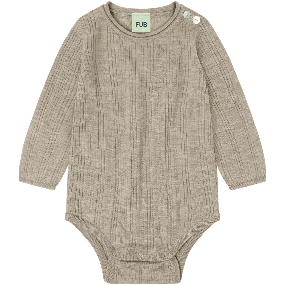 Wrap your little one in the cozy embrace of our FUB Oat Melange Baby Rib Body, a meticulously designed piece perfect for delicate skin. Crafted from 100% BLUESIGN® and RWS certified merino wool, this bodysuit features a charming irregular rib structure, complete with long sleeves and a soft, round neckline accented by a trendy roll-edge. It offers a practical design with a button closure at the shoulder, adorned with exquisite pearl shell buttons, and handy snap fasteners at the crotch for easy changing.