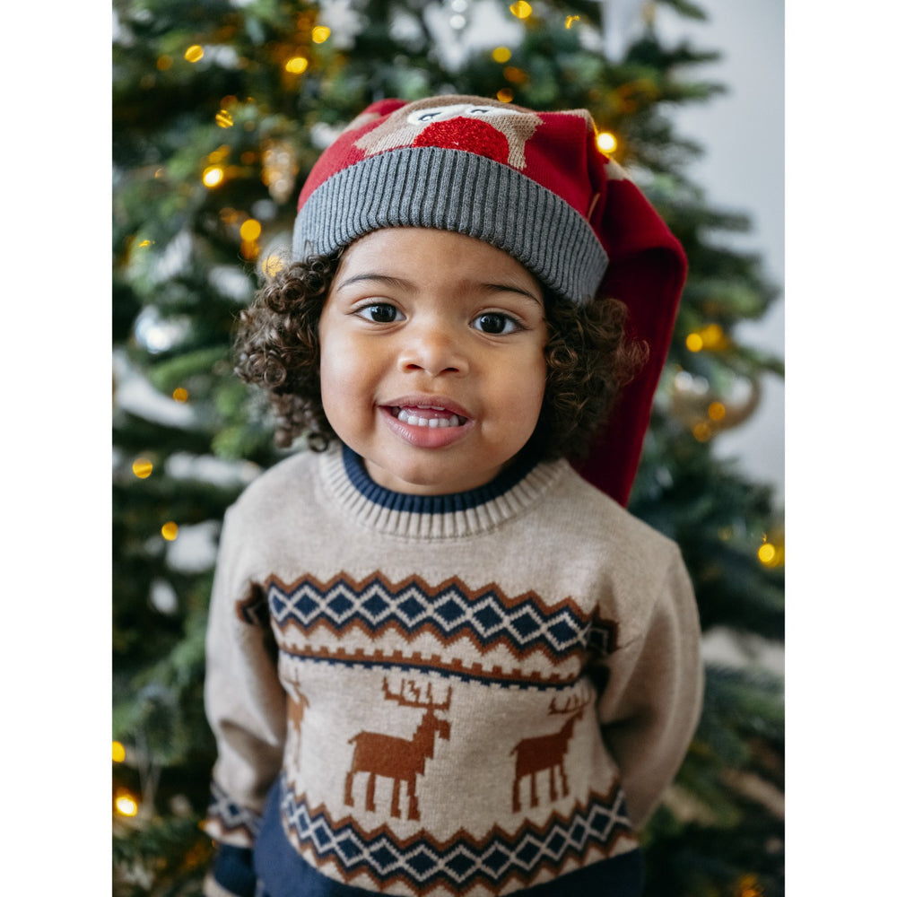This Christmas hat is not just about style; it’s built to last and easy to care for, maintaining its jolly look throughout the season. Offering a snug fit that stays secure, it's perfect for winter playdates, family gatherings, or any festive outing. Let this charming and sustainable hat be a part of your child's holiday wardrobe and watch the magic of Christmas come alive with Hust & Claire.