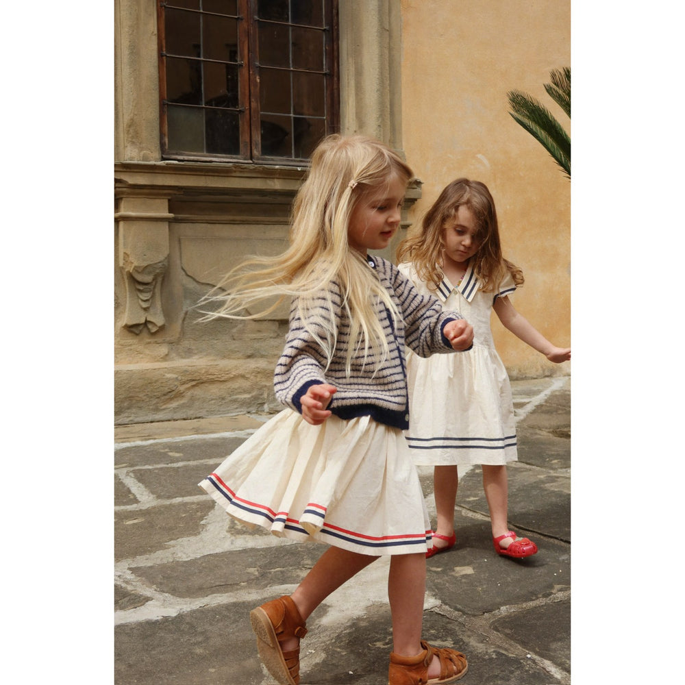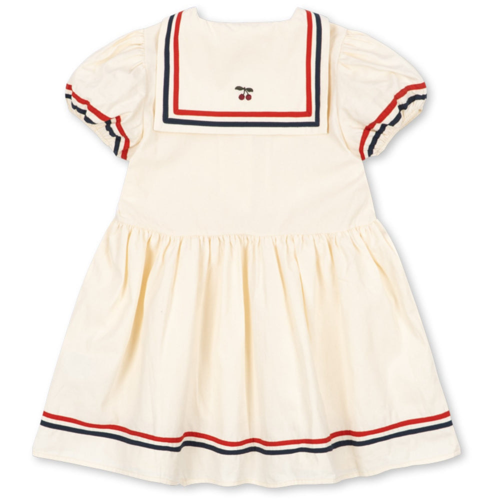 Step into style and sustainability with the Konges Sløjd Eggnog Allie Dress. This sailor-inspired dress charms with its oversized naval collar and puffy sleeves, adding a whimsical touch with its soft, gathered waist silhouette. Crafted from 100% GOTS-certified organic cotton, it promises not only environmental friendliness but also unmatched comfort and durability. Perfect for a variety of occasions, this dress offers both a delightful look and a conscious choice for your little one's wardrobe. Certifications: GOTS ORGANIC