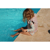 Introducing the delightful Konges Sløjd Fiola Manuca LS Swimsuit, designed with both style and protection in mind. This long-sleeved swimsuit highlights charming frill details and comes in an appealing color with intricate patterns that catch the eye while ensuring complete coverage and high sun protection with UPF 50+. Crafted from 80% recycled polyester and 20% elastane, the material is not only environmentally friendly but also highly durable and comfortable to wear. Specially designed for little ones, it includes practical press buttons at the leg opening for sizes from 6M to 18M, ensuring ease of wear and changing. This swimsuit has achieved GRS certification and meets the stringent OEKO-TEX® STANDARD 100, class 1 standards, ensuring it's free from harmful substances and is safe against your child's sensitive skin. Perfect for endless summer fun, this swimsuit combines durability, comfort, and eco-conscious fashion effortlessly.