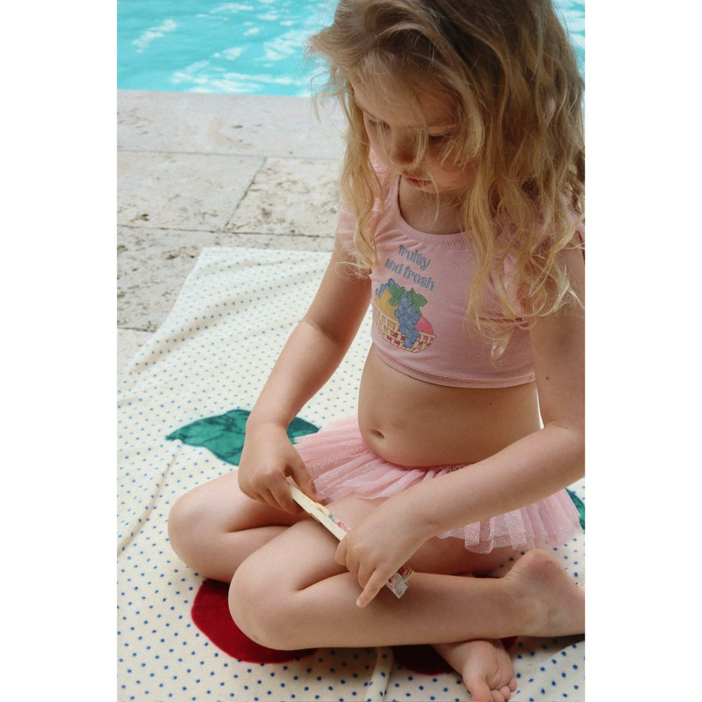 Dive into summer style with the Konges Sløjd Powder Pink Amandine Bikini. This charming set features a soft, shimmering fabric accented with playful tulle detailing on the bottoms. Crafted for both comfort and quick drying, it is perfect for any beach or pool adventure. The delicate powder pink hue adds a touch of elegance, making it a must-have for fashionable young swimmers.