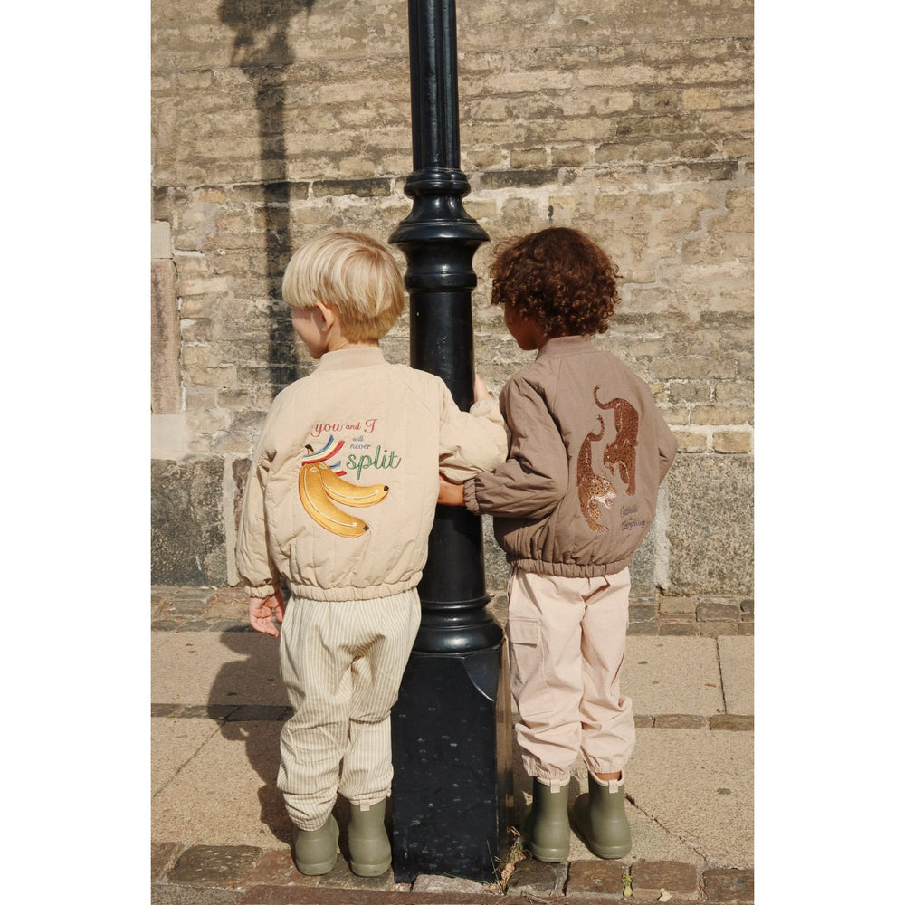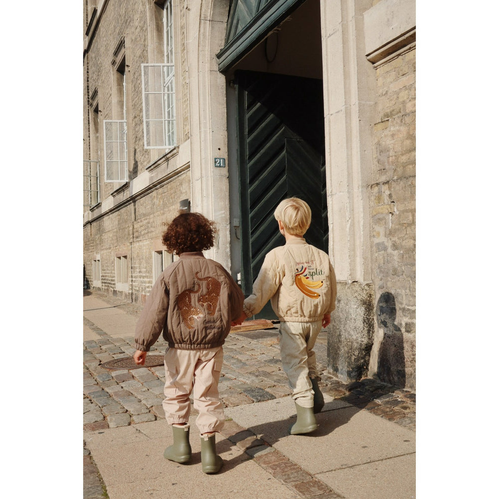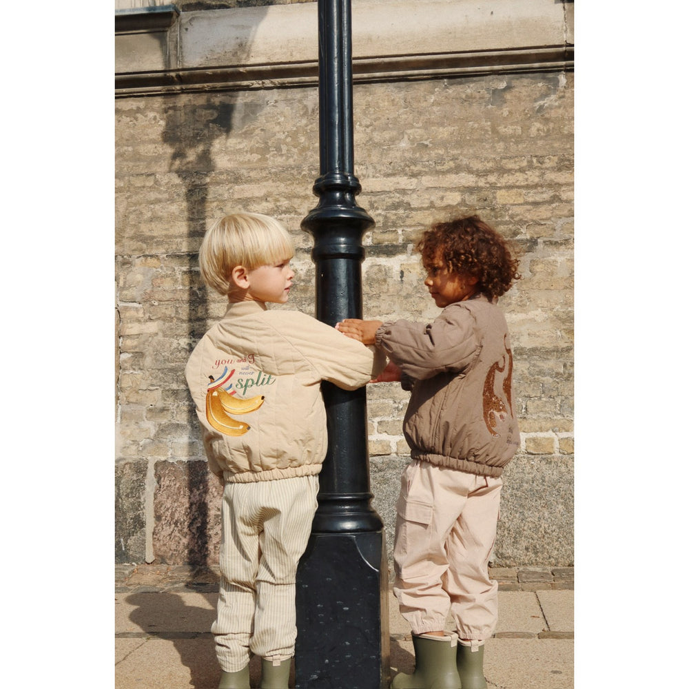 Introducing the Konges Sløjd Walnut Juno Bomber Jacket, a staple in our outerwear line designed for your little one's comfort and style. Crafted from lightweight yet warm polyester, this jacket ensures effective insulation. A true classic, the Juno Bomber features a breathable, fluorine-free impregnation to provide excellent wind resistance and water repellency. Its stylish design and neutral color make it versatile for any child's wardrobe, optimizing both functionality and fashion. Ideal for playing outside or layered for colder days, this jacket promises to keep your child cozy and dry while exploring the world.