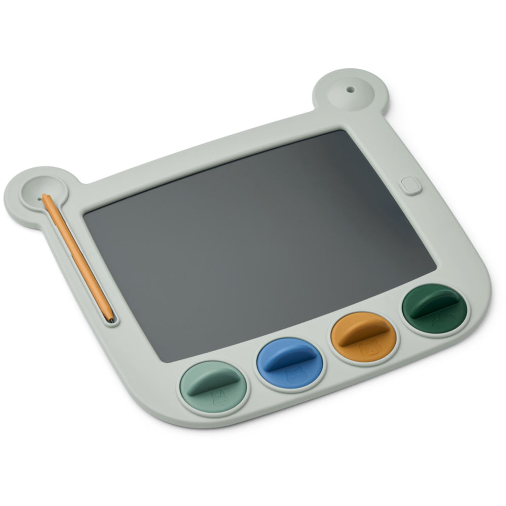 Introduce your little artist to the LIEWOOD Dove Blue Multi Mix Venzora Magic Drawing Board with Stamps. This charming bear-shaped LCD board comes equipped with a pen and four delightful silicone stamps, igniting creativity in your child. Its lightweight design boasts a screen lock to save masterpieces, an easy erase button, and a secure pen holder, making it ideal for travel. Encourage drawing skills while keeping everything tidy and effortless with this portable, reusable drawing board. Perfect for kids who love to create on the move! Age: 3y+ Materials: Frame And Pen: 70% Abs, 30% Recycled Abs,, Stamps: 100% Silicone Measurements: Width (Cm) 26; Length (Cm) 26; Depth (Cm) 2.2