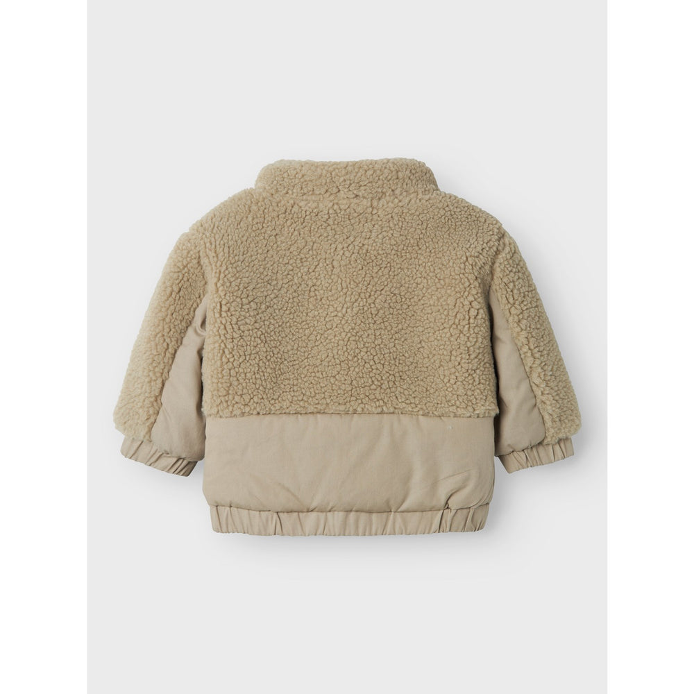 Introducing the charming Lil'Atelier Laurel Oak Nalo Loose Jacket, designed to add both style and comfort to your child's wardrobe. Crafted from luxuriously soft Sherpa, this jacket features a high stand-up collar and long sleeves with elasticated cuffs for a snug fit. The solid color and fluffy texture ensure a stylish look, complemented by a smooth organic cotton jersey lining for ultimate comfort. It also comes equipped with a secure zip fastening and elasticated hem to keep your little one cozy. Although the pockets are non-functional, they add a touch of style. Perfect for chilly days, this easy-care jacket promises to keep your child warm and fashionable. Note: Keep away from fire to ensure safety.