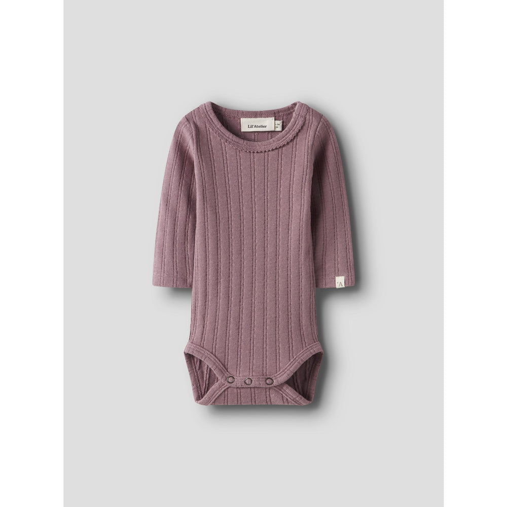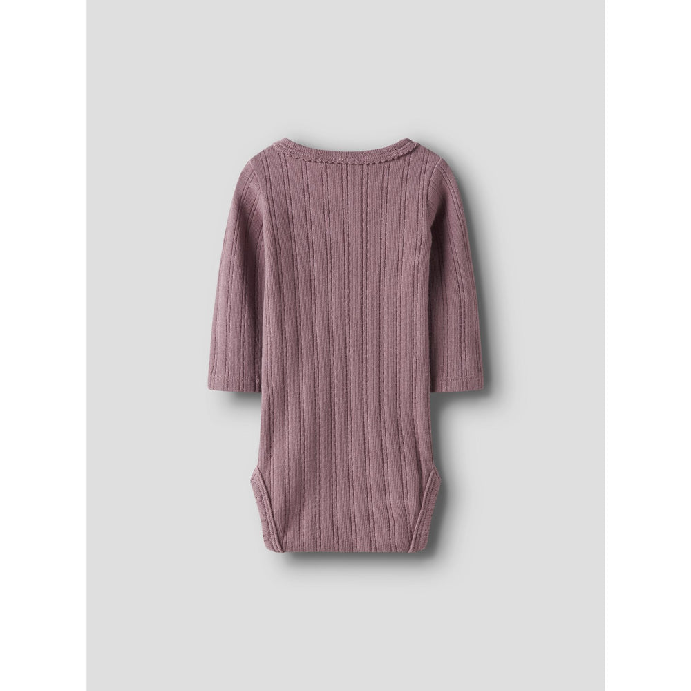 Dress your little one in the Lil'Atelier Nostalgia Rose Nbfrita Sig Ls Slim Body for a blend of comfort and style. Crafted from soft and stretchy jersey material, this bodysuit ensures a snug fit while allowing ample freedom of movement. The chic rose hue and simplistic round neck complemented by long sleeves make it a stylish choice for any occasion. Practical press stud fastenings at the shoulder offer ease of dressing. Safe and trendy, this outfit is ideal for both rest and play.