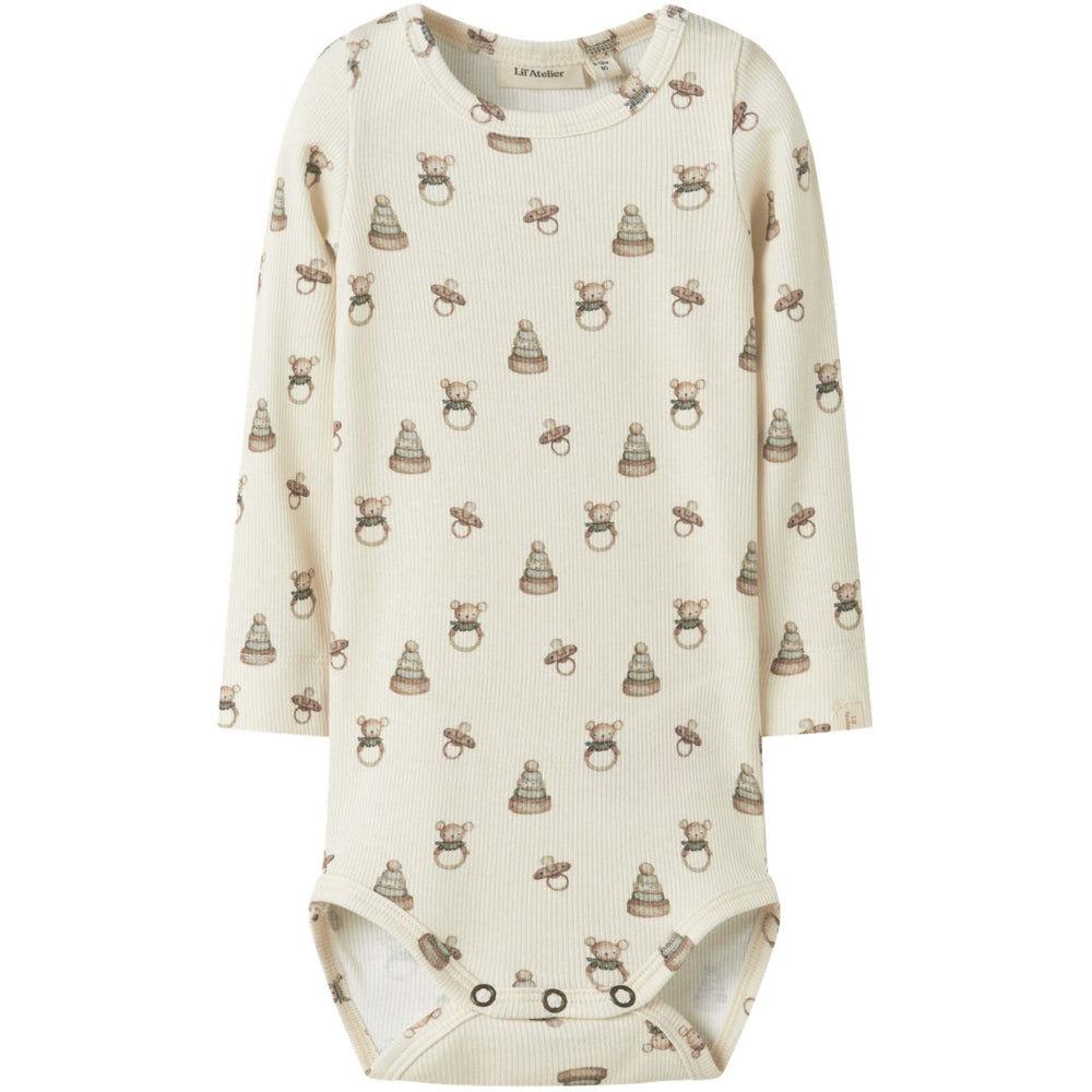 Dress your little one in the delightful Lil'Atelier Turtledove Toy Nbngavo Emo Ls Slim Body Lil Noos Bodysuit, where fashion meets comfort and safety. Made with soft, stretchy jersey fabric, this bodysuit ensures a snug yet flexible fit, perfect for your child's day-to-day adventures. The eye-catching printed design, paired with a classic grandad neck and long sleeves, adds a fashionable flair to any outfit.