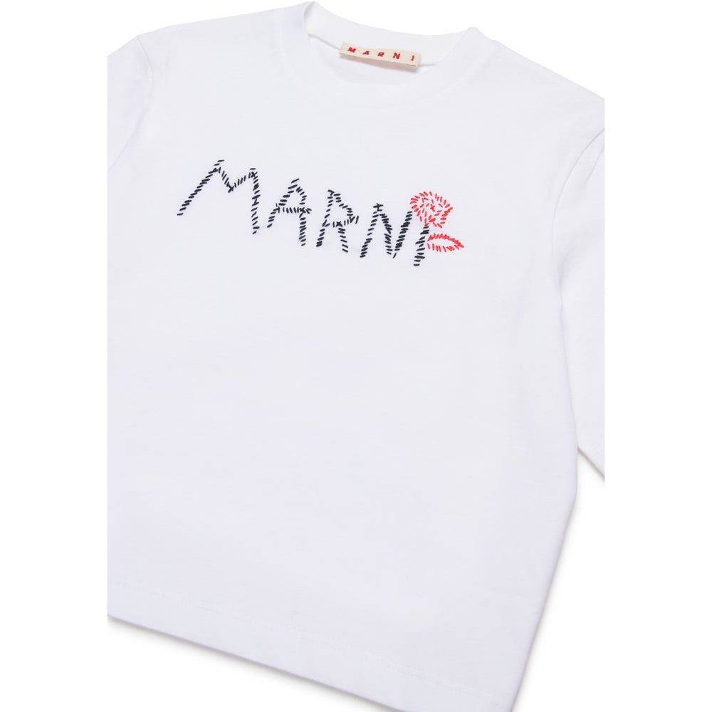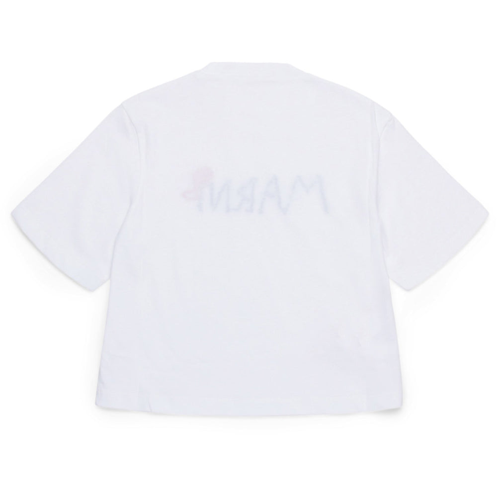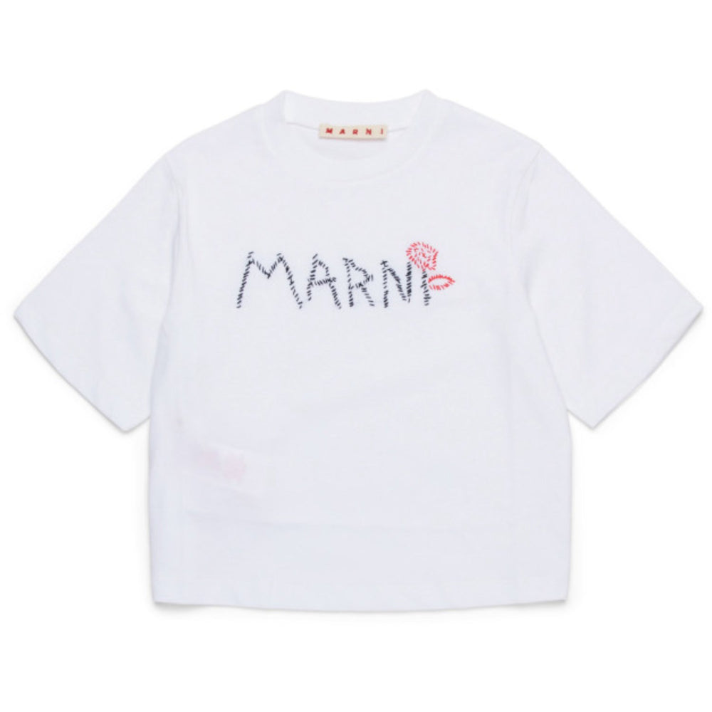 Discover the charming Marni white T-shirt, perfect for your child's wardrobe. Made from soft, durable fabric that ensures all-day comfort. The t-shirt presents itself in a fresh white color with a subtle pattern that adds style without overwhelming. Ideal for everyday use, it will keep its shape wash after wash.