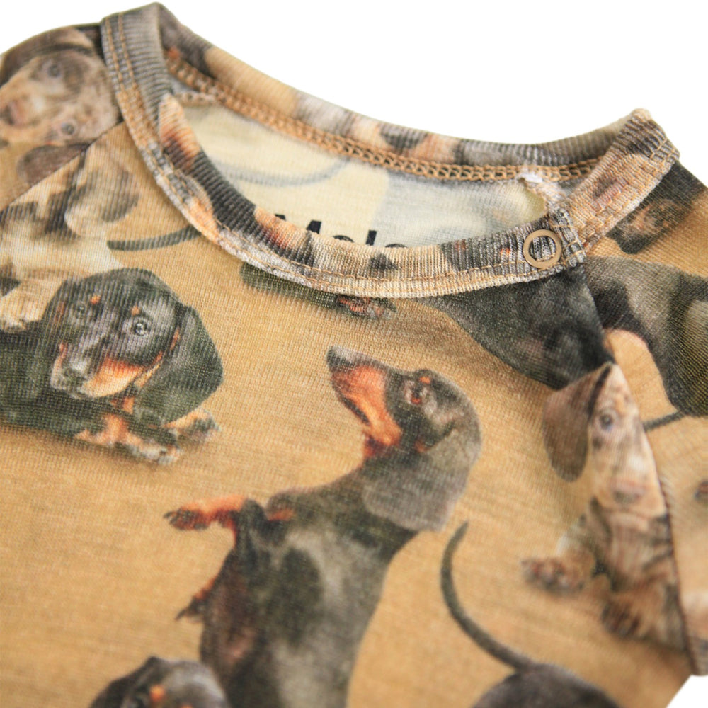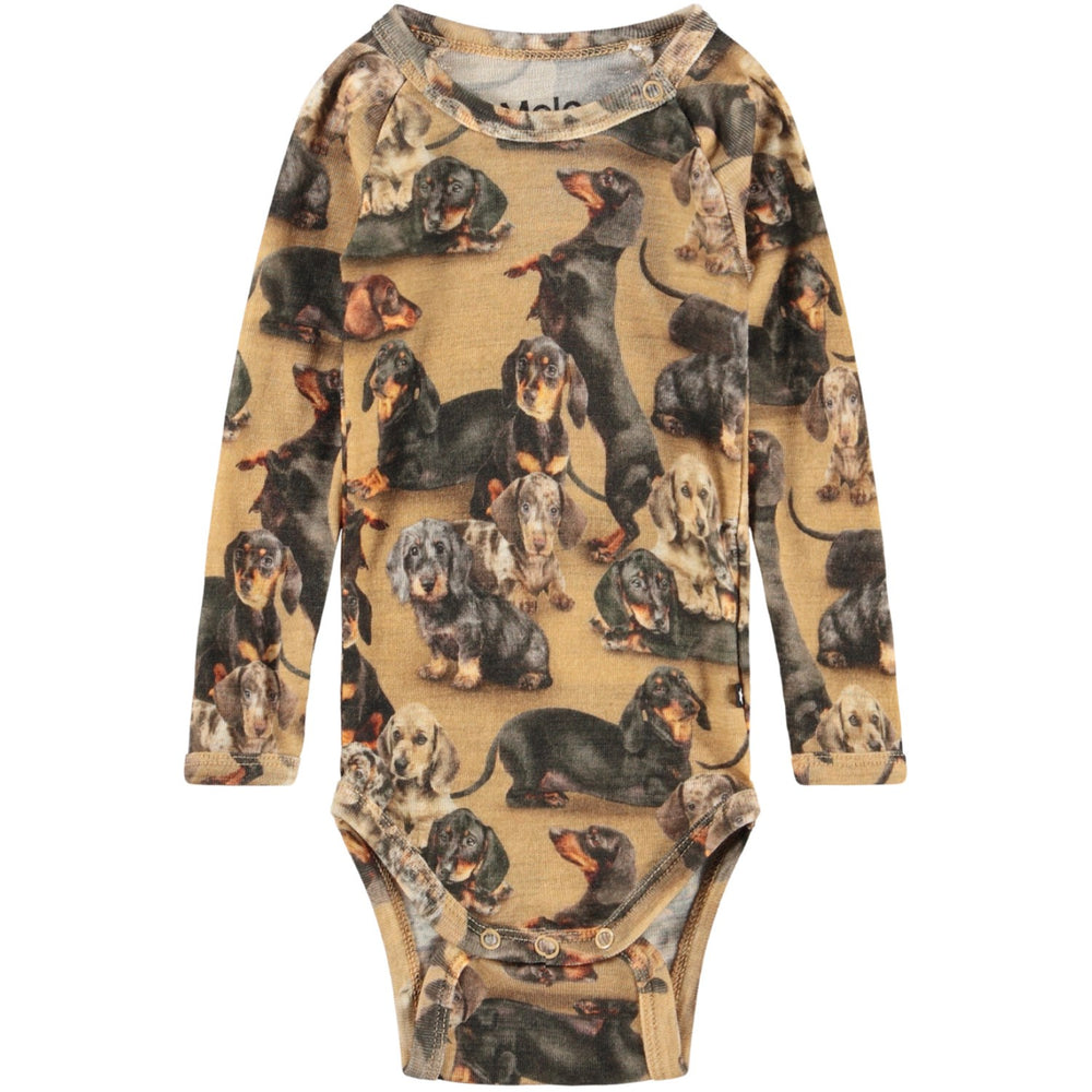 Brighten up your little one's day with the playful Molo Dachshund Farai Wool Bodystockings LS! Crafted from cozy wool, this bodysuit showcases a charming dachshund pattern in vivid colors. Tailored for comfort, its fit ensures easy movement, perfect for your active infant. Easy to care for, it offers both style and practicality for everyday adventures. Ideal for layering during cooler days, it promises to keep your child snug and stylish.