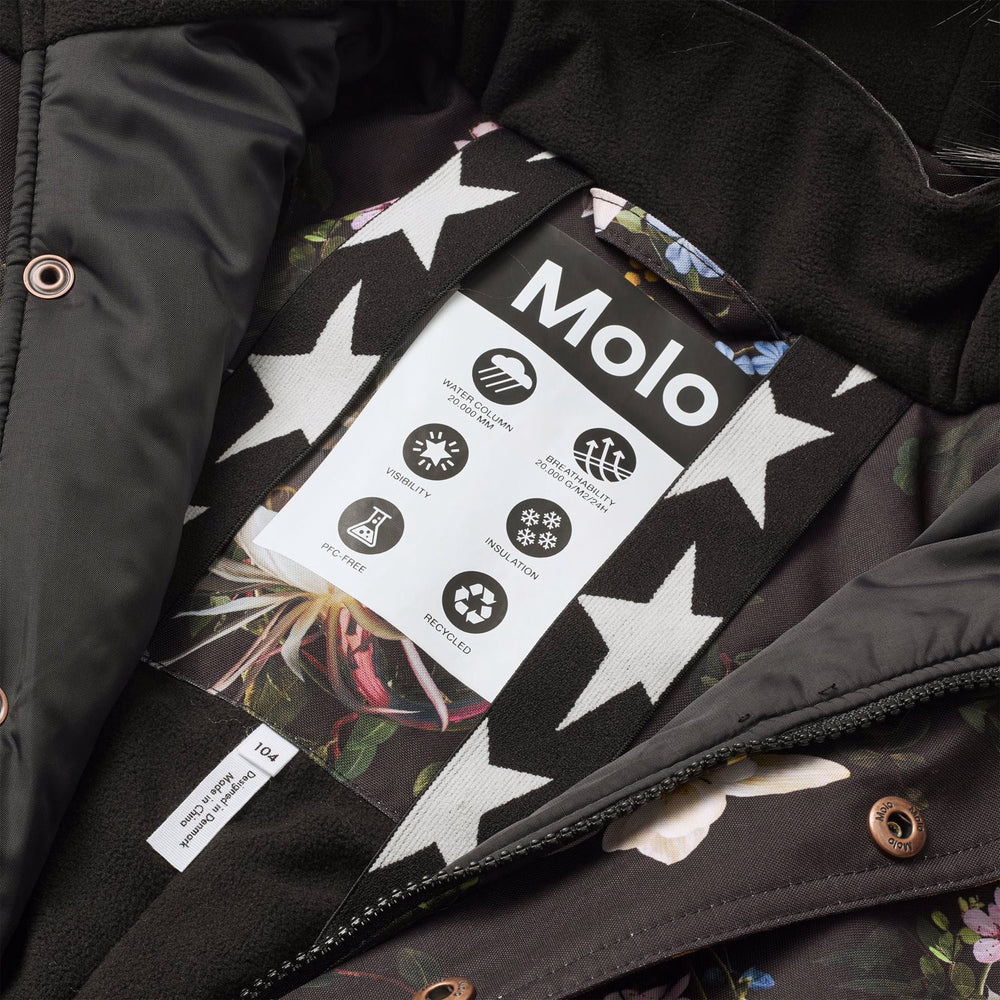 Discover the charm and functionality of the Molo Paisley Flowers Polaris Fur Junior Snowsuit, perfect for your little explorer. Crafted from premium materials, this suit features a vibrant paisley floral pattern with a cozy fur-trimmed hood. The design ensures a comfortable fit, ideal for playful activities in the cold. It's easy to care for and promises to keep your child warm and stylish during winter adventures. Filling: 83% Polyester recycled from post-consumer waste/ 17% Polyester Lining: 100% Nylon recycled from Pre-consumer waste Materials: 55% Polyester, 45% Polyester recycled from post-consumer waste