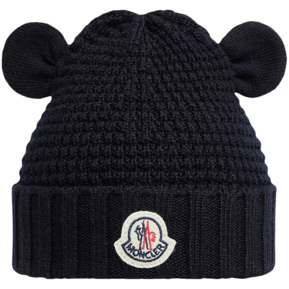 Wrap your little one's noggin in the cozy warmth of this adorable Moncler navy beanie! This hat is designed with soft wool to keep the cold at bay and has cute teddy bear ears that add a touch of playfulness. Perfect for both baby boys and girls, it features a stylish logo patch that marks their very first taste of Moncler luxury. Ideal for milder weather, this mid-weight knitted hat is both charming and functional.
