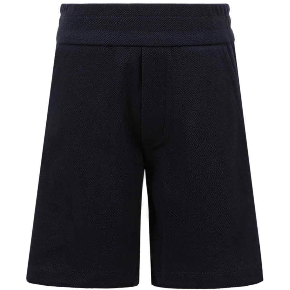 Dress your kid for comfort and style with the Moncler Navy Sweat Shorts. Made from soft, breathable cotton piquet, these shorts are ideal for active, warm days. They feature a flexible elastic waistband for a perfect fit and come with handy side pockets and a distinctive tricolour trim on the back pocket. The blend of navy color and sporty design makes them versatile for various occasions, ensuring your child stays comfy and stylish all day long. Easy to care for, these shorts promise to be a favorite in your child's wardrobe.