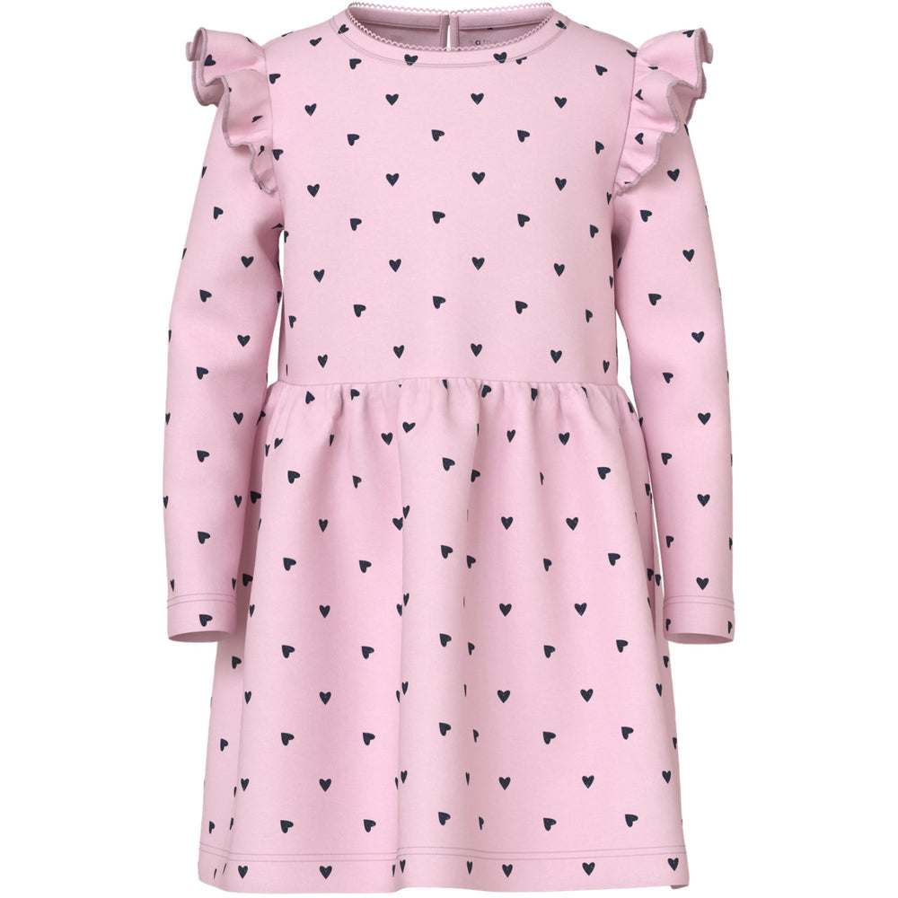 Introducing the Name It Ballerina Dheart Dress, a charming addition to your child's wardrobe. Crafted from rib knit material with excellent elasticity, this dress promises a comfortable fit and ease of movement, perfect for any season. Featuring a classic round neck, long sleeves adorned with frills, and a captivating glitter detail, this dress stands out with a unique full-surface print. Its timeless vertical striped pattern adds a touch of elegance. Ideal for daily wear or special occasions, this dress combines style and practicality effortlessly.