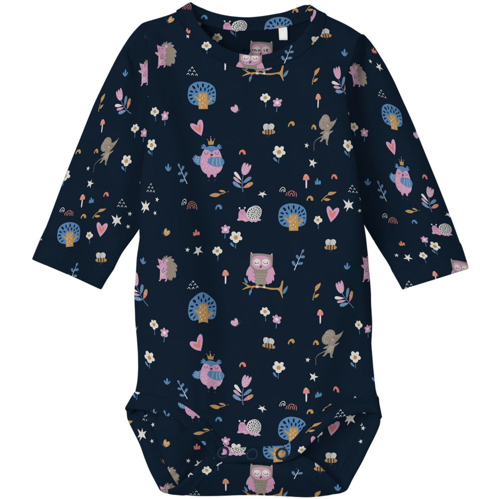 Dress your little one in the Name It Dark Sapphire Birds Vandora Body, which blends impeccable style with cozy comfort. Crafted from soft, stretchy jersey, this bodysuit ensures freedom of movement and a gentle touch on your child's skin. It features a chic round neck, long sleeves, and convenient press stud fastening for easy dressing. The dark sapphire hue adorned with a delightful bird pattern makes it a fashionable choice for any occasion. Perfect for daily wear, this bodysuit combines functionality with a dash of charm, ensuring your child looks great and feels comfortable all day long. Materials: 95% Organic cotton, 5% Elastane Materials and care: Wash and iron inside out. Wash with similar colors Washing instructions: Maximum Washing Temperature 40°C - Normal Process