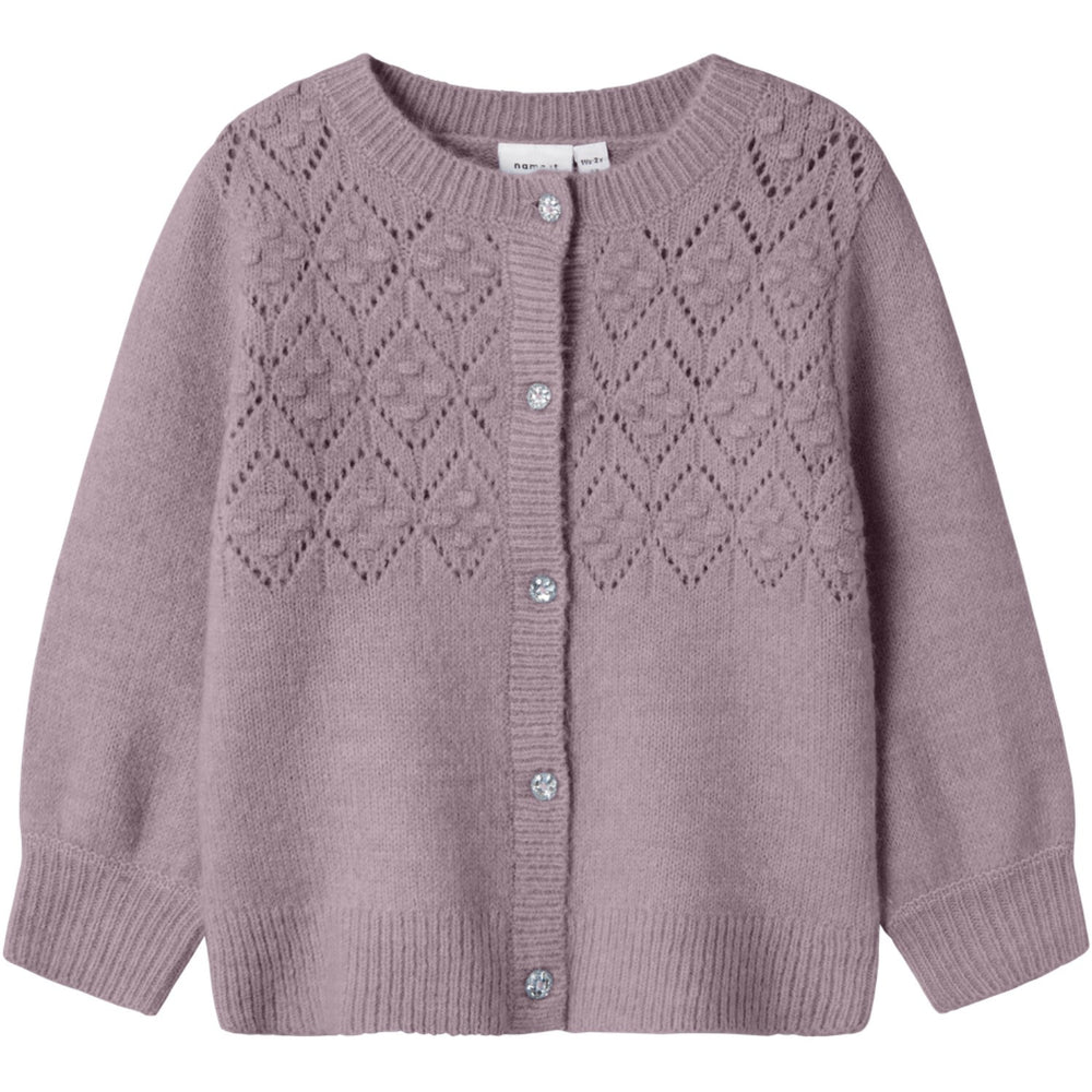 Introduce your little one to the elegance of our Name It Elderberry Batrille Knit Cardigan. Crafted from soft pointelle knit with a delicate geometric pattern, this cardigan features long sleeves, ribbed cuffs, and a classic round neck. It closes with buttons and is designed for a comfortable regular fit, making it ideal for both everyday wear and special occasions. Stylish and practical, this piece promises to be a cozy addition to your child's wardrobe.