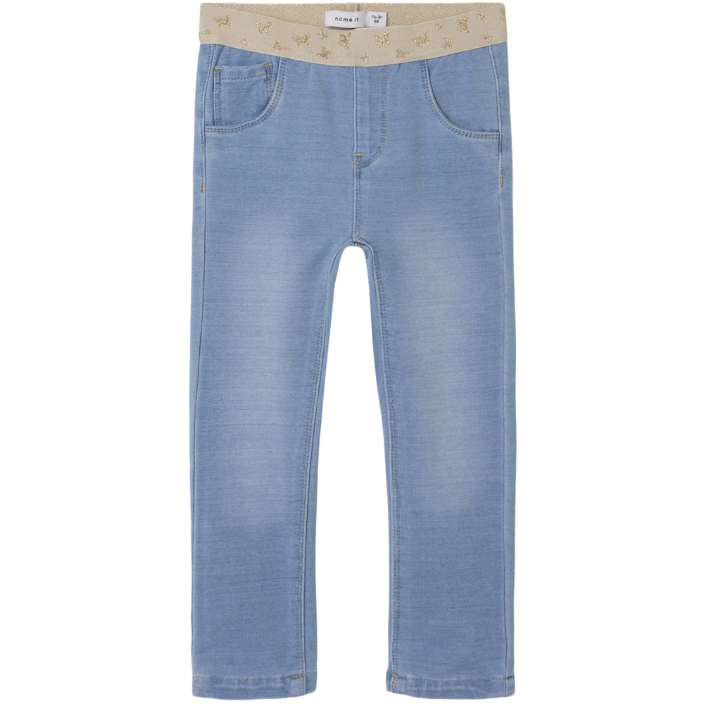 Introduce your little one to the charm of classic denim with our Name It Light Blue Denim Butterfly Salli Slim Sweat Jeans. Crafted from soft sweat denim, these jeans combine the authentic indigo look with unrivaled comfort, making them perfect for active kids. The slim fit design with front pockets is enhanced by sparkling glitter details and stylish rivets, adding a touch of whimsy to the overall look. These jeans are designed to allow freedom of movement while ensuring a snug fit around the hips and legs. Ideal for both everyday adventures and special occasions, they promise durability and easy care — simply keep away from fire and follow the care instructions to maintain their delightful appearance. Choose these jeans for a blend of style, comfort, and practicality that your child will love!