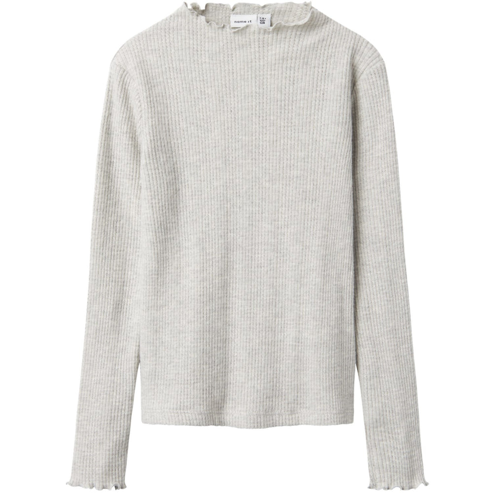 Dress your little one in the chic Name It Light Grey Melange Tulpu Blouse, an ideal addition to their daily wear or for dressing up on special moments. This top features a classic round neck and long sleeves finished with delicate babylock edge cuffs, adding a touch of elegance. Tailored in slim fit, the blouse promises a sleek look while ensuring ample movement for active children.