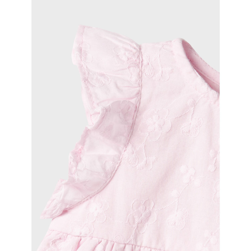 Introducing the charming Name It Light Lilac Detine Spencer Dress, perfect for brightening your little one's wardrobe this spring and summer. Crafted from woven fabric with a classic criss-cross pattern, this dress offers a clean look with a subtly textured surface. Its delightful light lilac color is adorned with elegant embroidery and playful frills, making it a stylish choice for any occasion.