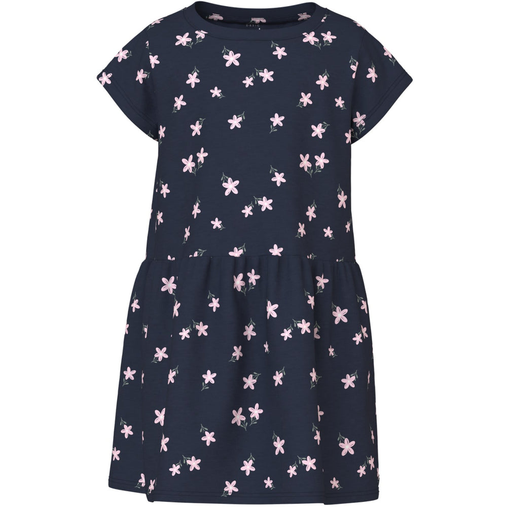 Introducing the Name It Navy Blazer Flowers Vilinse Dress—an enchanting addition to your child's ensemble. Crafted from jersey material, this dress offers a soft and stretchable feel that ensures comfort and mobility. Featuring a charming all-over floral print, the design includes a round neck and cap sleeves, providing a regular fit that's perfect for any active child. Its easy-care fabric is ideal for both playful afternoons and special occasions. Delight in the stylish blend of functionality and flair with this must-have dress from our trusted brand.