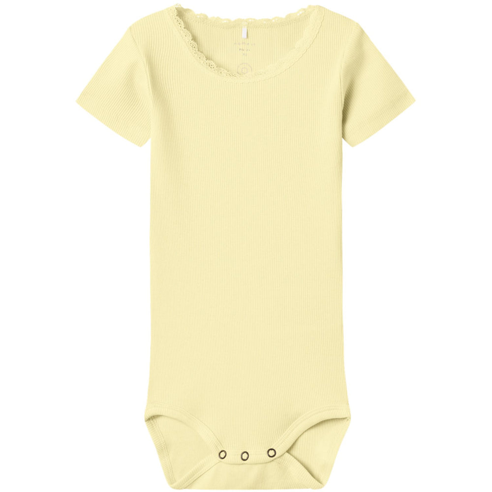 Delight in the cheerful charm of the Name It Pastel Yellow Kab Body Noos, perfect for your little one. This soft, pastel yellow bodysuit features a comfortable round neck and short sleeves, crafted for ease and snug fit. Its lightweight material ensures comfort and ease of movement, making it ideal for playtime or naptime. Durable and easy to care for, this adorable piece combines functionality with style, keeping your child both cute and comfy throughout their day.