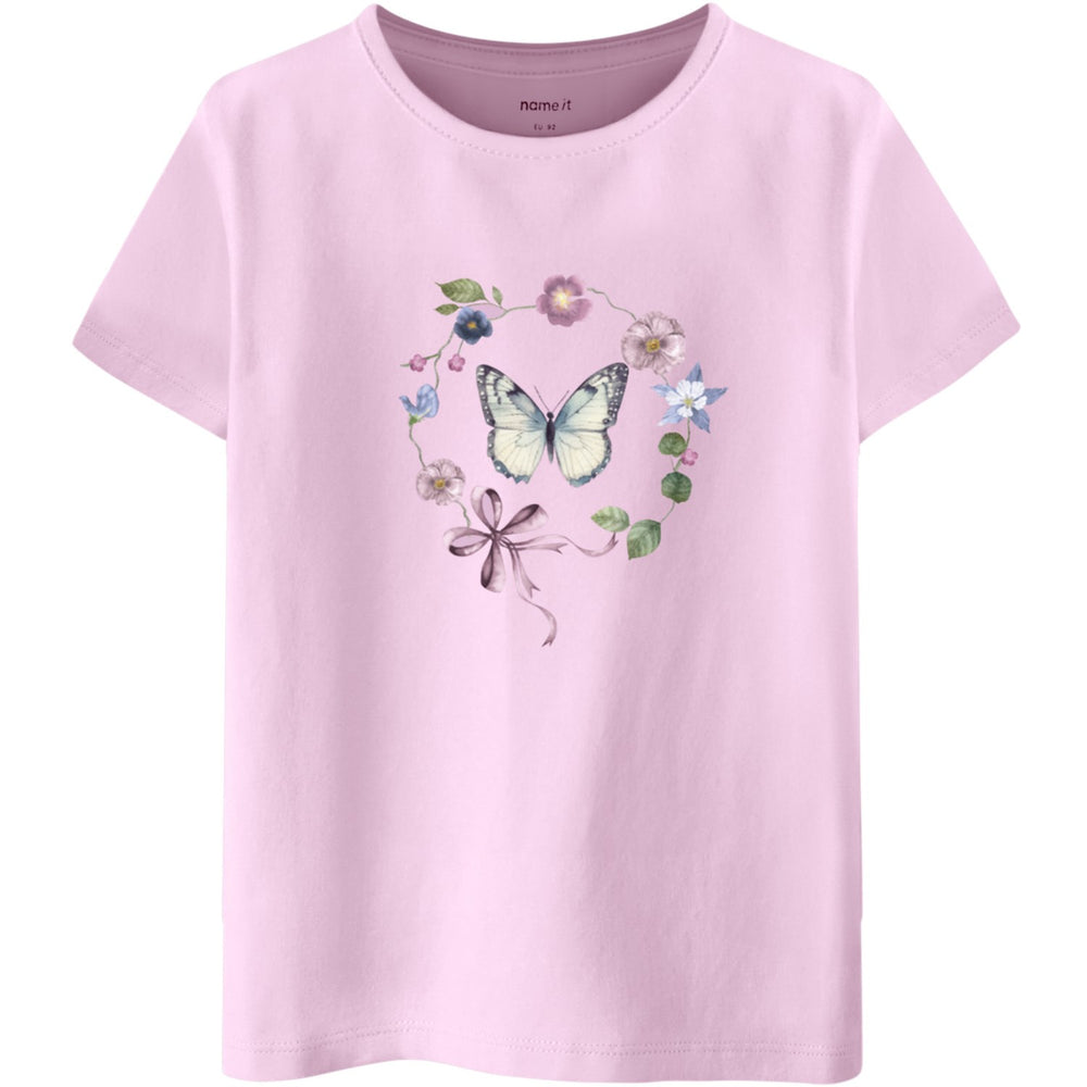 Dress your little one in the Name It Pirouette Nmffalcana Ss Top Box, a charming T-shirt that blends comfort with playful style. Crafted from soft, stretchy jersey, this top ensures ease of movement and a cozy feel, perfect for active children. It features a classic round neck, short sleeves adorned with glitter details, and a gentle pigment print. The standard fit and vibrant design make it an ideal choice for everyday wear, promising both durability and easy care. Ideal for adding a touch of sparkle to any child's wardrobe! Fit: Standard Materials: 95% Cotton - Organic, 5% Elastane