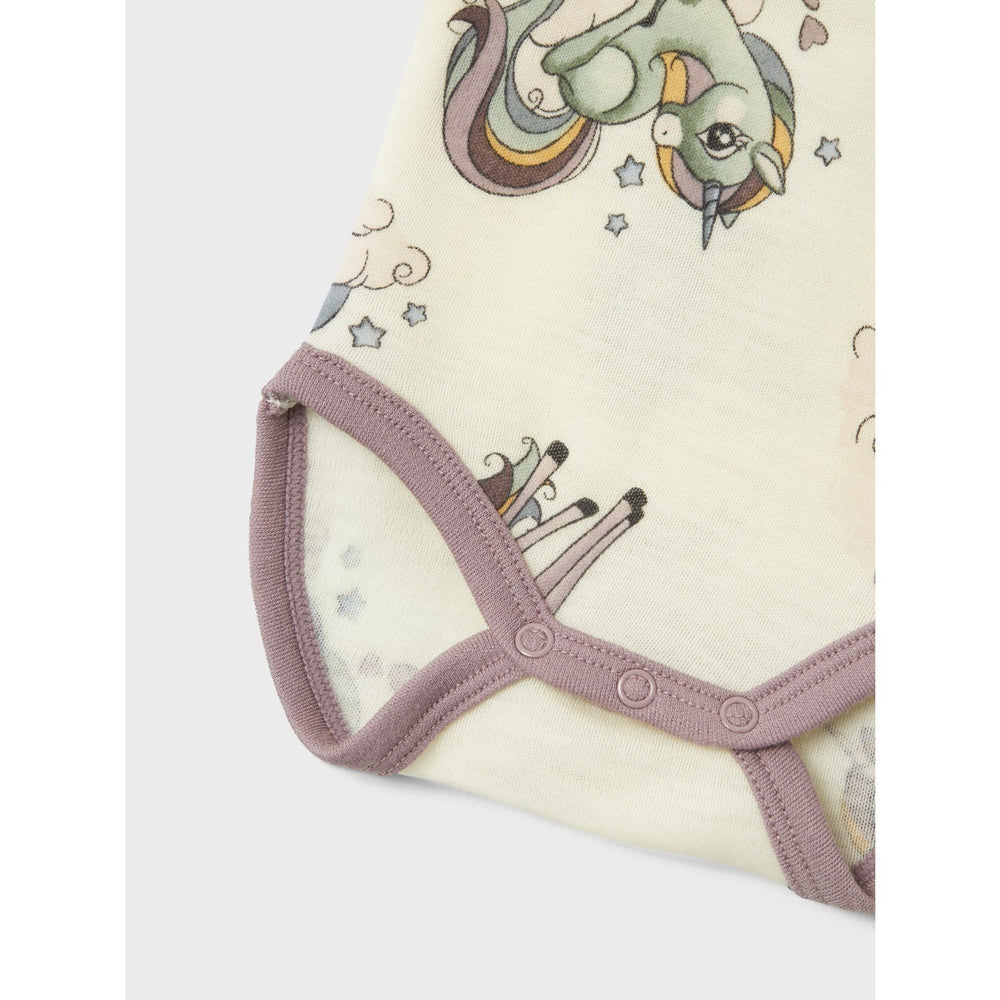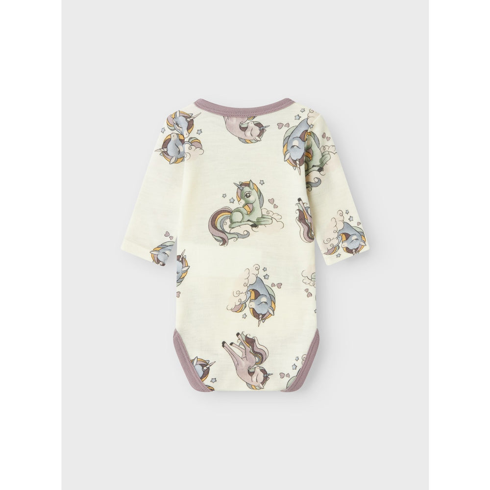 Introducing the 'Name It Snow White AOP Willitus Wool Body Noos,' a must-have bodysuit that combines style and functionality for your little one's comfort. Crafted from premium wool, this bodysuit not only offers unparalleled softness but also excellent thermal qualities, ensuring your child stays warm in cold weather and cool when it's warm. The adorable all-over print adds a touch of whimsy, while the practical design features a round neck and long sleeves for full coverage. Additionally, dressing is made easy with press stud fastenings in the crotch up to size 86. Ideal for year-round wear, its breathable material maintains a stable body temperature, even when wet. Perfect for any occasion, this bodysuit is a versatile and durable addition to any child's wardrobe. Materials: 100% Merino wool Materials and care: Max shrinkage 8%. Only use silk or wool detergent Washing instructions: Maximum Washing Temperature 30°C - Gentle Process