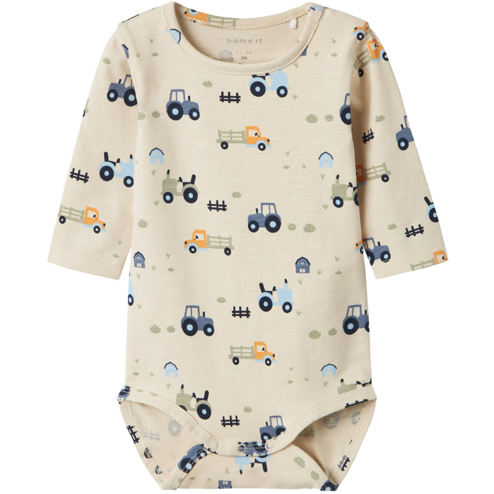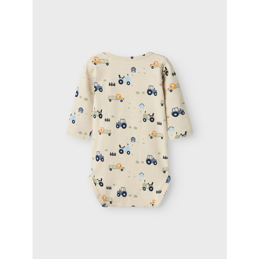 Introduce cozy comfort to your little one's closet with the Name It Summer Sand Bassen Body, an all-year-round essential. Crafted from soft, stretchy jersey, this bodysuit features a snug round neck, long sleeves, and a delightful pattern repeated across its entirety. Easy-to-use press stud fastenings ensure quick changes, while the material offers both comfort and mobility. Keep in mind, for safety, keep this garment away from fire. Ideal for playful days, this durable and adorable bodysuit blends functionality with style seamlessly.