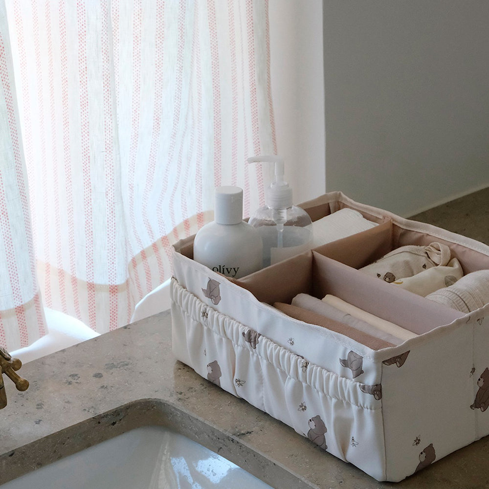 Discover the charm and utility of the That's Mine Bees And Bears Lily Nursing Organizer, a must-have for any children's room. This highly functional storage box is expertly designed with one large compartment featuring removable dividers secured by practical Velcro closures. This smart design allows you to tailor the space to fit all your changing essentials, including diapers, creams, and cloth diapers. Additionally, the organizer comes with one large and two small pockets for even more storage options.