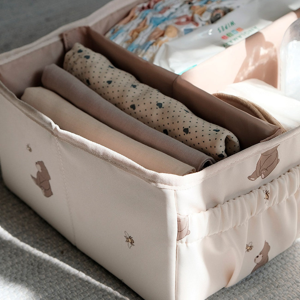 Compact and space-saving, the storage box can be easily folded up when not in use, providing an excellent solution for tight spaces. Its dimensions are 32 x 22 x 13 cm, ensuring you have ample room while maintaining a tidy and stylish environment. This versatile organizer not only enhances the aesthetics of your nursery but also keeps everything organized and within reach, making it a perfect blend of style, comfort, and practicality. Ideal for busy parents, it makes changing time a breeze and ensures that your child's necessities are orderly and accessible. Materials: 50% Recycled polyester, 50% polyester Washing instructions: Do not dry clean, Do not tumble dry, Do not iron, Do not wash