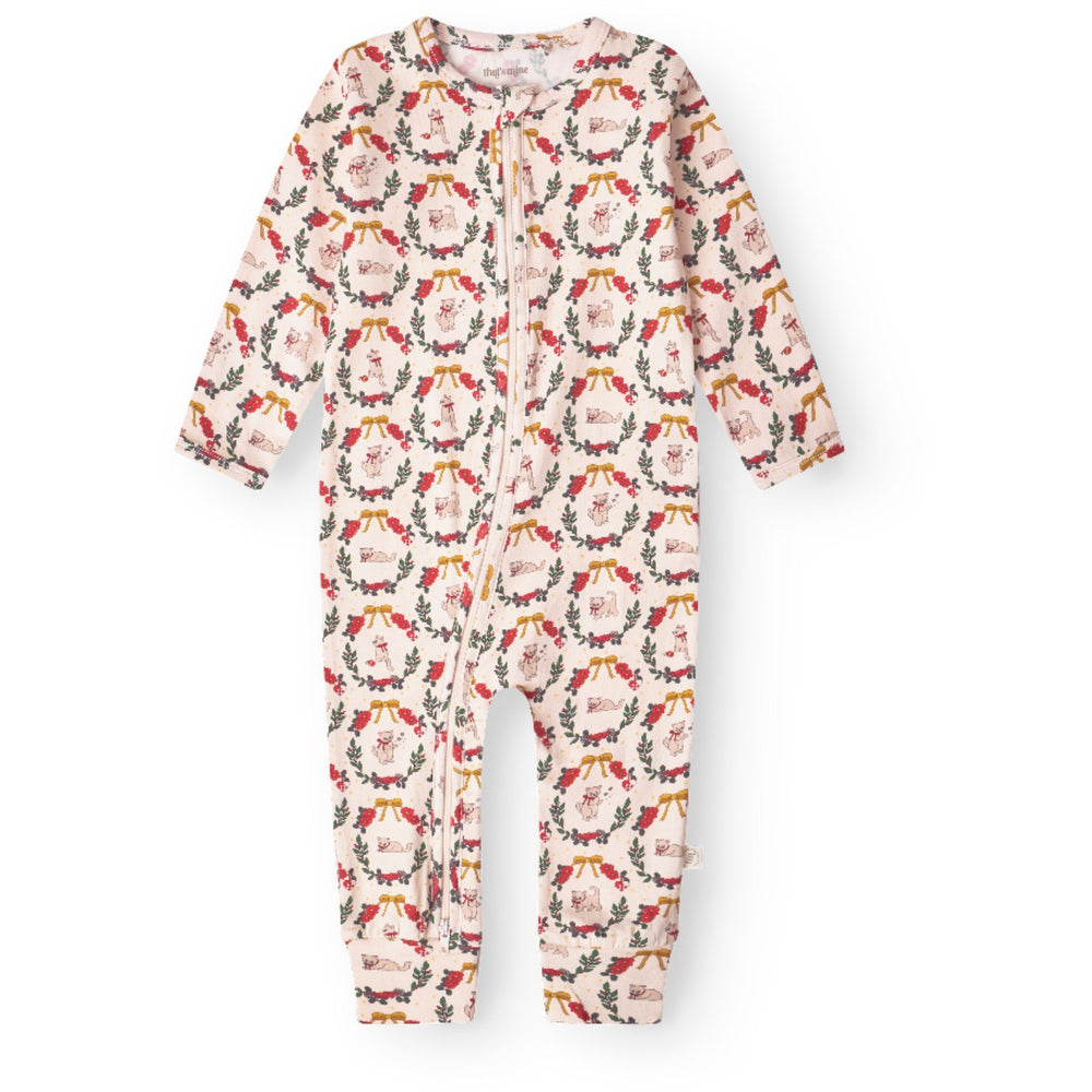 Brighten your little one's wardrobe with our That's Mine Christmas Wreath Elliotte Onesie, tailored to simplify parents' lives. At the heart of this onesie is the innovative two-way zip, designed to make nappy changes swifter, ensuring more cuddle time with your baby. Crafted from plush organic cotton, it offers unmatched softness and a gentle touch, ideal for delicate skin. Its versatile design allows use as a comfortable nightie or a snug outfit for everyday activities, guaranteeing your child warmth and comfort throughout their daily adventures. Embrace easy wear and care with this charming, functional addition to your baby's essentials. Materials: 48% Organic cotton, 47% Modal, 5% Elastane Washing instructions: Wash warm (max 40°C), Iron cool (max 100°C), Tumble dry on low heat, Do not Bleach, Do not dry clean