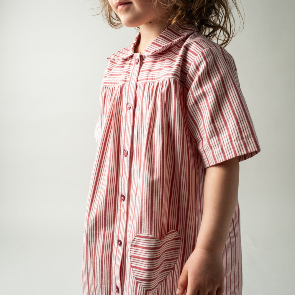 Introducing the That's Mine Classic Red Heart Dress, where timeless style meets playful charm. Crafted from a soft and durable fabric, this red and white striped shirt dress ensures your child feels comfortable whether at play or at a gathering. Adorned with heart-shaped buttons and matching heart-shaped pockets, it adds a delightful twist to your little one's wardrobe. Easy to care for and designed to last, it's as practical as it is adorable. Perfect for any occasion, this dress promises to keep your child looking cute and feeling great! Materials: 100% Organic Cotton Washing instructions: Wash warm (max 40°C), Iron cool (max 100°C), Tumble dry on low heat, Do not dry clean