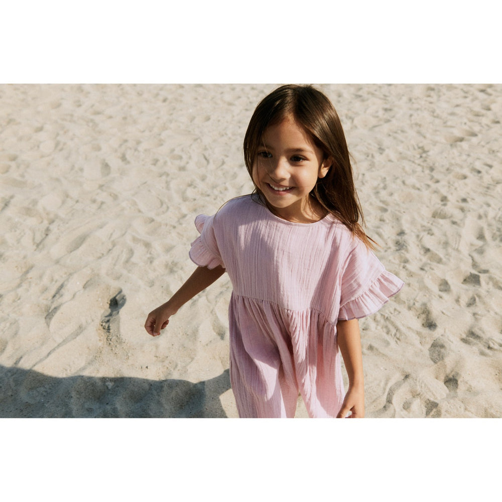 Whisk your little one into the whimsy of Wheat’s Lavender Mist Dress Thit—a delightful ensemble perfect for playful days under the sun. Crafted from 100% organic cotton, this dress promises comfort with a roomy fit and dropped shoulders finished with quaint ruffles. The charming crinkled gauze texture and sweet gatherings add a dash of magic, swirling around the knees in a dance of joy. Button closures at the back ensure dressing up is a breeze. Whether paired with sandals for a summery vibe or layered with leggings for cooler weather, your child is set to shine in sustainable style.