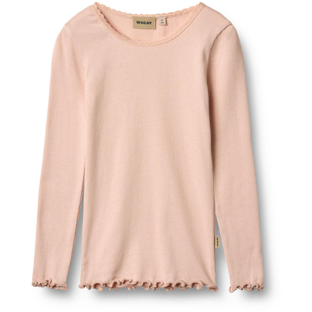Discover the charm and comfort of Wheat's Powder Rib T-Shirt L/S Reese for children. Expertly crafted from a blend of 48% organic cotton and 48% Lenzing modal, along with 4% elastane, this long-sleeved rib T-shirt combines softness with stretch for exceptional wearability. The fitted design features exquisite lace details at the neckline and overlocked edges at the cuffs and hem, enhancing durability and style.